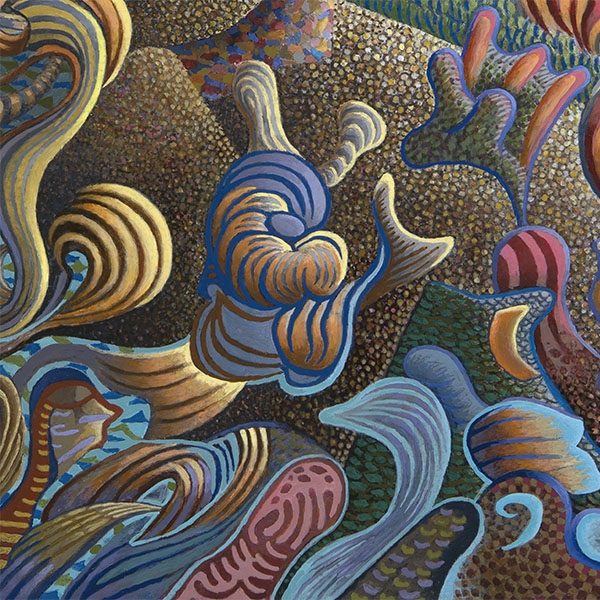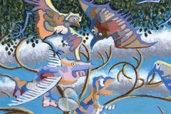 At first glance this picture purports to be a real scene with water in the foreground, trees in the middle, and strange looking hills at the top. However, the initial composition was based on completely abstract shapes which later morphed into birds and fish as the picture progressed. As with Jacob’s Ladder, you need to look at this close up. All the creatures, whether sea cucumbers, catfish or strutting birds are made up of stripes, blotches or colours completely unlike reality. This creates the possibility of making them much more expressive as their limbs and bodies can be extended and exaggerated for maximum impact.